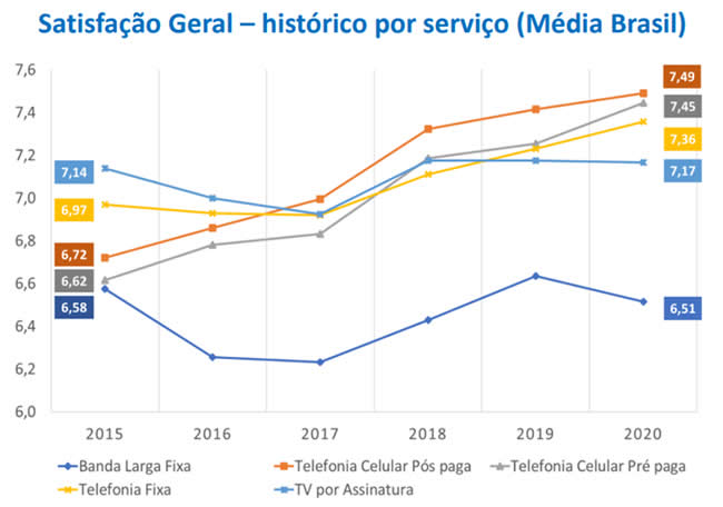 No ano passado, a satisfação geral do brasileiro em relação ao serviço de Banda Larga Fixa sofreu uma queda comparado ao ano anterior, ficando com média geral 6,51. Para a Anatel a queda teve a ver com a pandemia causada pelo coronavírus, pois desde então muitas pessoas passaram a trabalhar, estudar desde casa demandando mais da internet residencial.