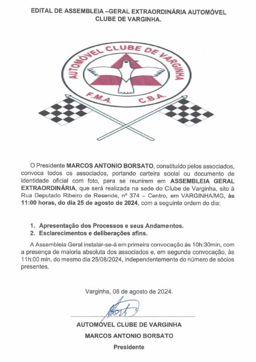 O Presidente MARCOS ANTONIO BORSATO, constituído pelos associados,convoca todos os associados, portando carteira social ou documento de identidade oficial com foto, para se reunirem em ASSEMBLEIA GERAL EXTRAORDINÁRIA, que será realizada na sede do Clube de Varginha, sito àRua Deputado Ribeiro de Resende, n° 374 - Centro, em VARGINHA/MG, às 11:00 horas, do dia 25 de agosto de 2024, com a seguinte ordem do dia:
