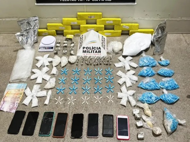 No interior do imóvel, os policiais localizaram um verdadeiro depósito do tráfico. Foram apreendidas grandes quantidades de entorpecentes já fracionados e embalados para a venda, que incluíam: pinos de cocaína, tabletes e buchas de maconha, pedras de crack e porções de cocaína em pó. Além das drogas, a PM apreendeu dinheiro, celulares e materiais típicos da atividade criminosa, como embalagens e microtubos vazios.