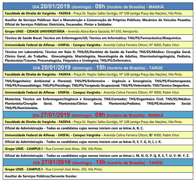 A prefeitura de Varginha divulgou nesta quinta-feira (3) os locais onde serão realizadas as Provas Objetivas do Concurso Público do município. De acordo com a Prefeitura, devido à necessidade de ajustes operacionais decorrente do número de inscritos, exclusivamente a Prova Objetiva dos cargos de auxiliar de serviços públicos/servente escolar e oficial de administração foi transferida para o dia 27/01/2019. A data da Prova Objetiva dos demais cargos permanece inalterada, ou seja, em 20/01/2019.